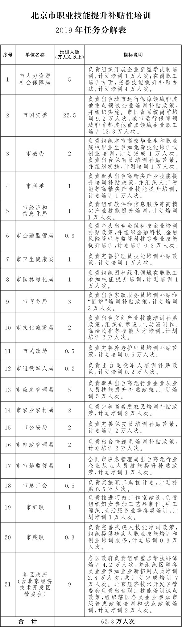《北京市职业技能提升行动实施方案(2019-2021年)》已经市政府同意,现印发给你们,请认真组织实施。