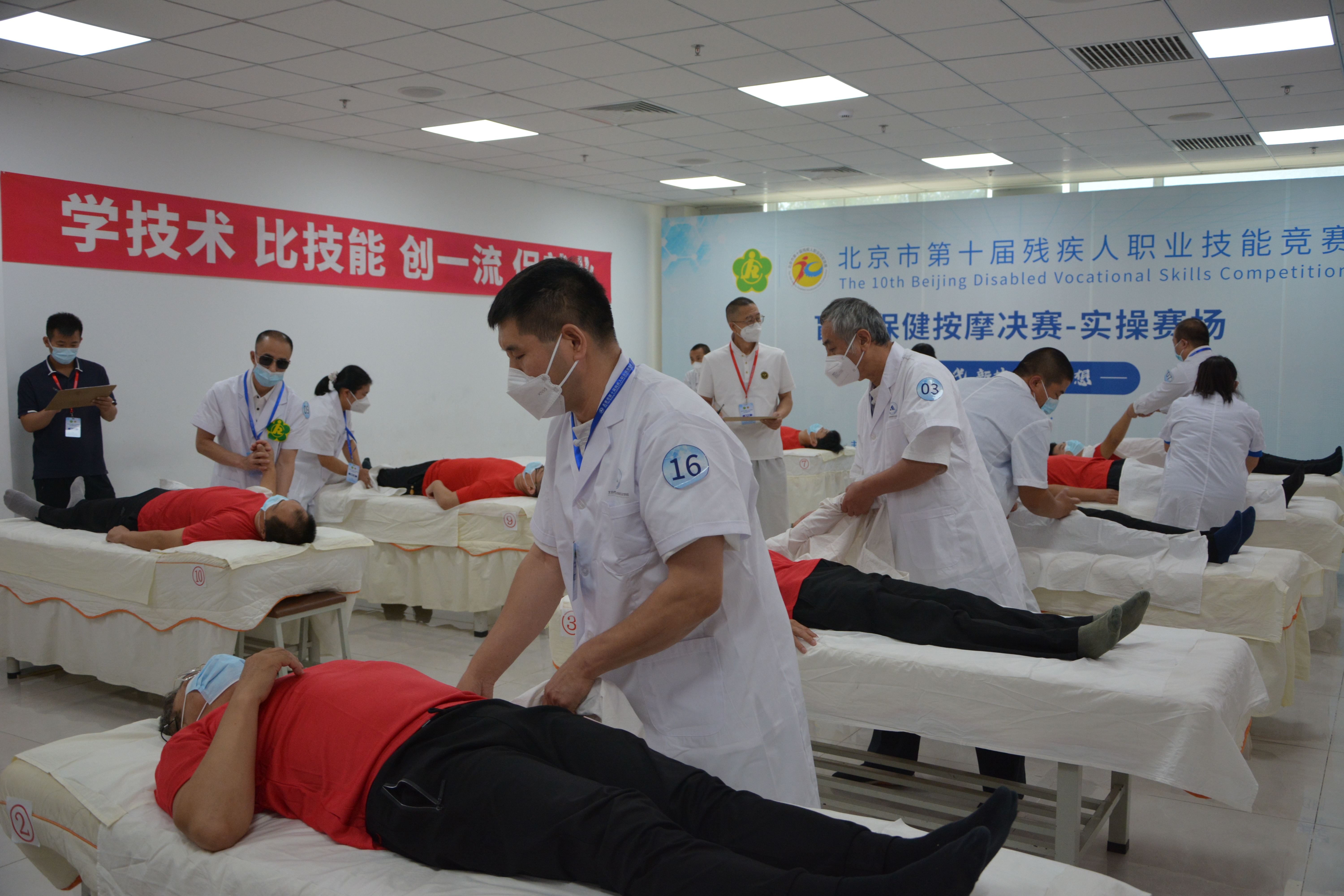 北京市第十届残疾人职业技能竞赛盲人保健按摩项目,在全市设立四个赛区,通过近一个月的比拼选拔,23名选手晋级决赛。经过理论和实操两个部分的激烈的角逐,前三名分别由丰台区、朝阳区、顺义区选手获得,四名选手分别获得优秀选手奖和拼搏奖。